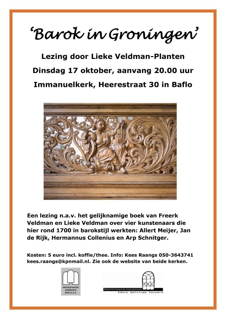 Op dinsdagavond 17 oktober zal Lieke Veldman-Planten een lezing houden over “Barok in Groningen” n.a.v. het gelijknamige boek dat zij en haar man Freerk Veldman geschreven hebben.