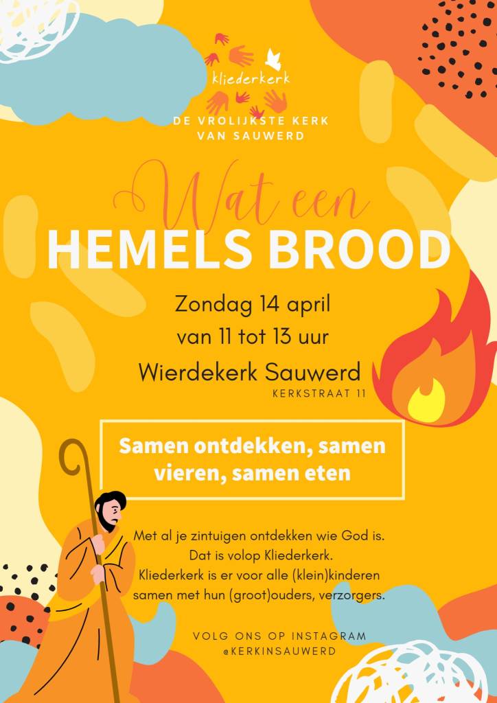 Hoera! Het is weer bijna zover: de vrolijkste kerk van Sauwerd! Op zondag 14 april vanaf 11 uur is het weer feest in de Wierdekerk. We duiken met elkaar een Bijbelverhaal in dat gaat over brood, water en vuur, en bevrijding. Nieuwsgierig? Je bent welkom!