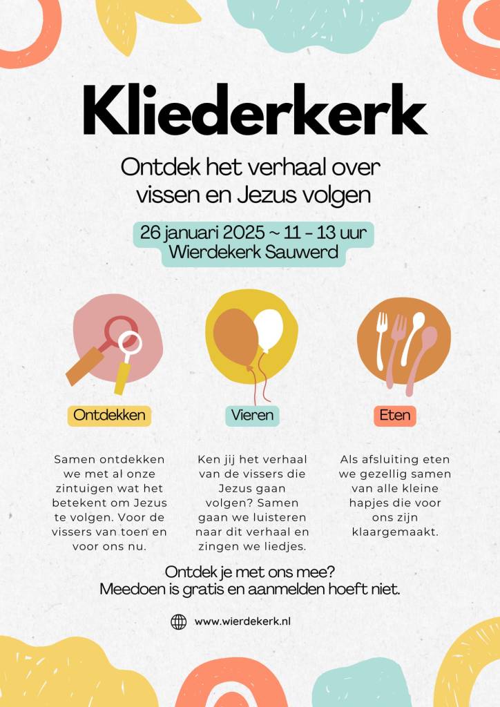 Zondag is het weer Kliederkerk! Deze keer over ‘Jezus volgen’. Het gaat over vissers die niets vingen, en toen door Jezus aan het werk gezet werden. Daarna wilden ze niks anders meer dan achter hem aan.