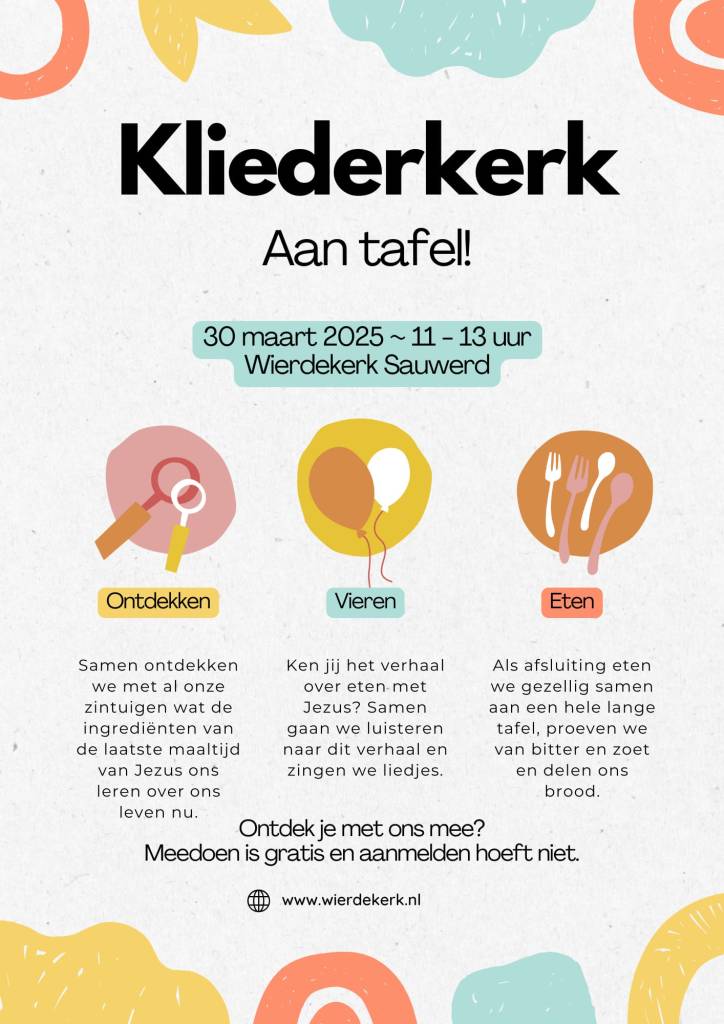 Kliederkerk is er voor alle leeftijden: kinderen met hun ouders of grootouders. Oudere kinderen zijn welkom om mee te doen of te helpen. Wil je graag helpen, laat het even weten!