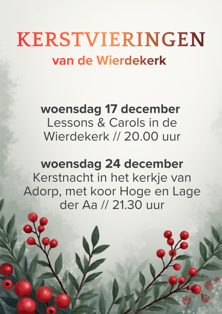Op kerstavond, woensdag 24 december, vieren we kerstnacht in het witte kerkje van Adorp. Dat doen we als gemeente van de Wierdekerk samen met het Adorpse koor Hoge en Lage der Aa, onder leiding van Agnes Rozeboom en met Roele Kok op de piano. De samenzang wordt op het orgel begeleid door Arie van Wijk. Voorganger is ds. Gertine Blom.
